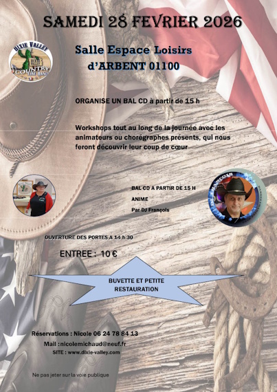 | 28/02/2026 | ARBENT 01 - Espace Loisirs - Bal Cd animé par François - ouverture des portes 14 h 30 - Bal Cd avec workshops tout au long de la journée avec les chorégraphes ou animateurs présents lors de cette journée à partir de 15 h- Entrée 10 € | ||||